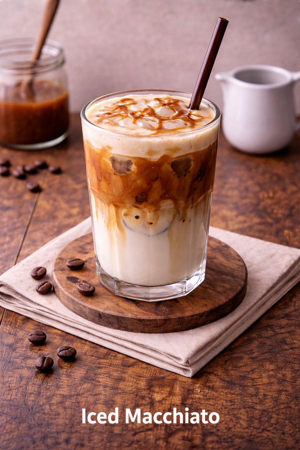 Susu dingin dengan es batu yang diberi espresso di atasnya